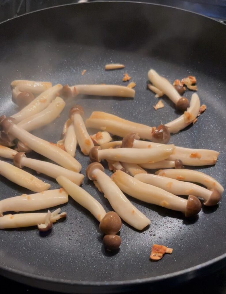 ここで色が付きすぎてしまうと、ぶなしめじを炒めている最中に焦げてしまいます。色が付き始めるくらいで次の工程に進みましょう。