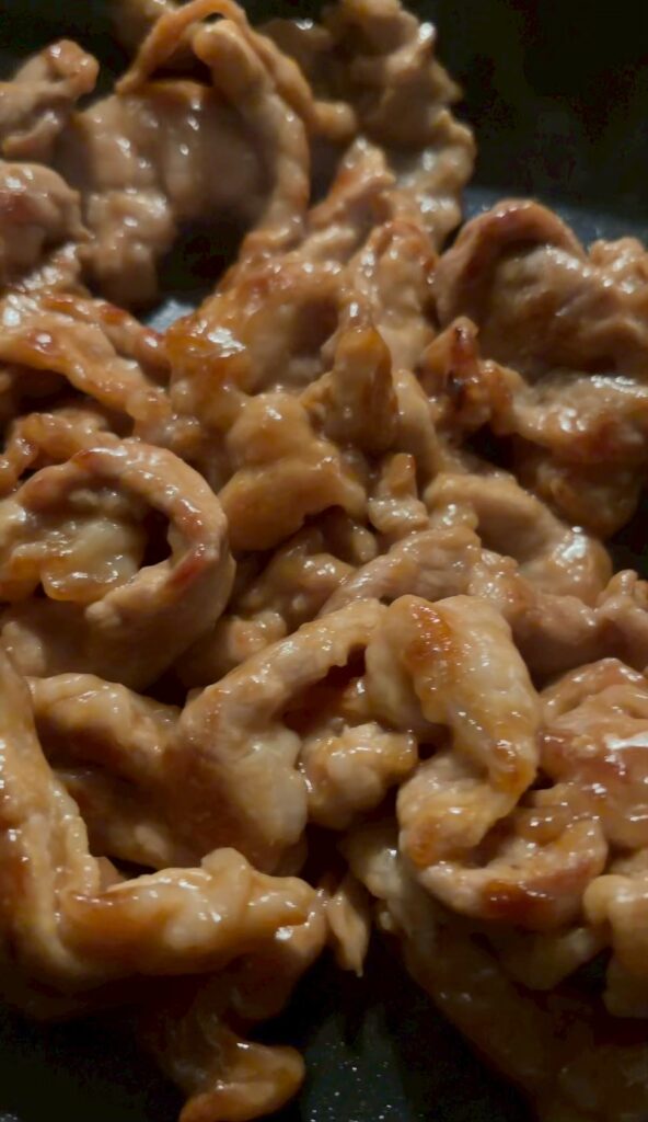 - フライパンに油を入れて中火で熱し、豚こま肉を広げて焼きます。