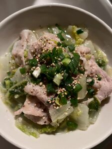 水溶き片栗粉を加え、とろみをつけます。最後にごま油を回しかけ、ラー油はお好みで。仕上げに小ネギを散らすと見た目も香りもアップします。