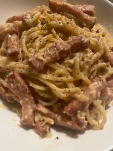 フライパンを傾けて溜まった油に調味料を加えると良いです。