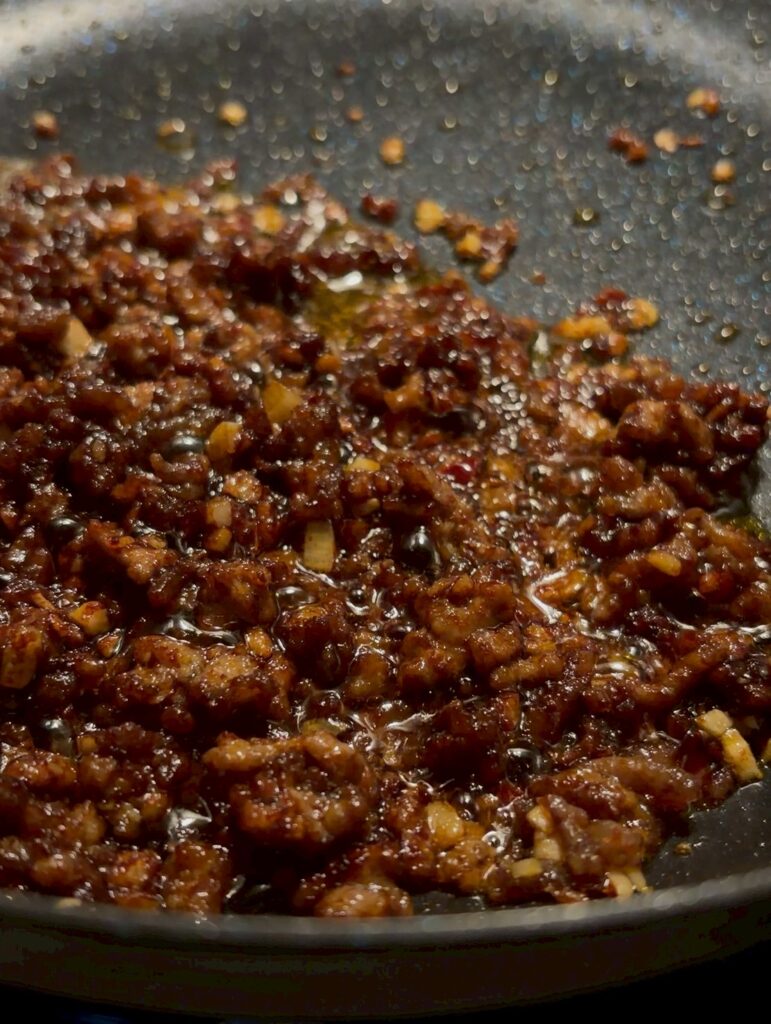 ひき肉に焼き色がついたら、にんにく・しょうがを加えて弱めの中火で炒めます。香りが立ったら豆板醤→甜麺醤の順に加え、油になじませながら混ぜます。焦げやすいので、よく混ざったら一度火を止めると安心です。